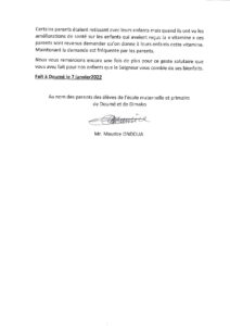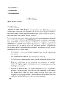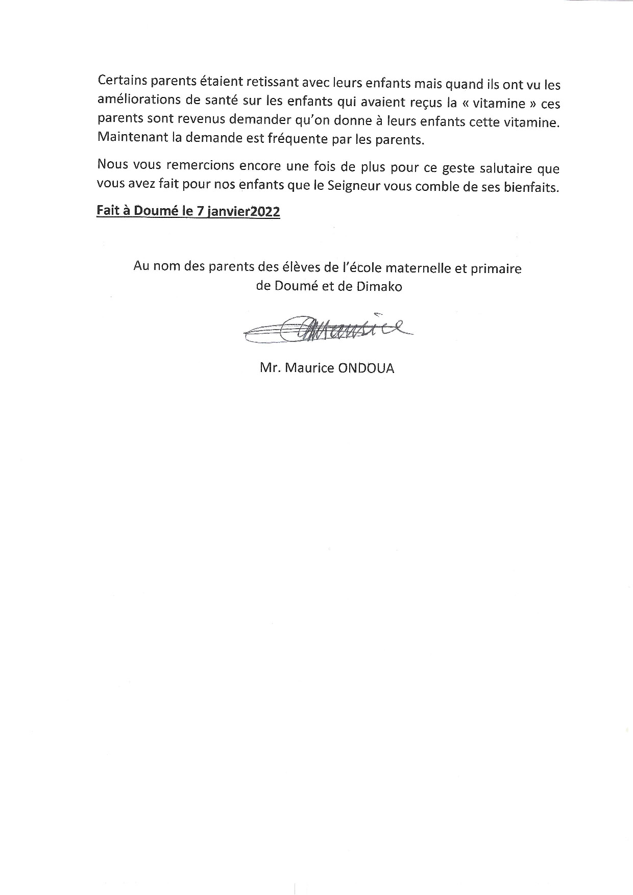 Siostra, w liście do Bonimedu pisze, że wiele dzieci ze szkoły, którym podawano Antybiobon, odzyskało radość życia. Poprawił im się apetyt i stały się bardziej odporne niż wcześniej. Zauważa także, że u większości dzieci pojawił się lekki przyrost wagi. Dodaje, że wielu dorosłych również poświadcza o dobroczynnym działaniu tego leku w aspekcie apetytu jak i kondycji fizycznej. Za wszystkie te dobrodziejstwa. w imieniu społeczności szkolnej, szczerze dziękuje. Do listu dołączyła podziękowania pana Maurice’a Ondoua, ojca jednego z uczniów.